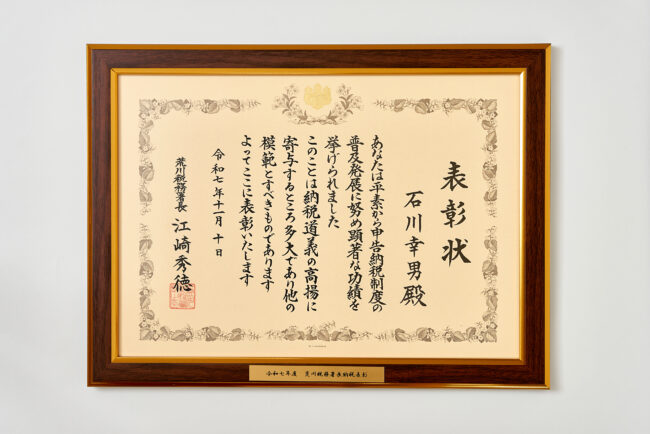 税務署主催の「令和7年度 納税表彰式」に石川社長が出席し、表彰状を頂きました。